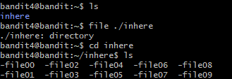 The password for the next level is stored in the only human-readable file in the inhere directory. Tip: if your terminal is messed up, try the “reset” command.