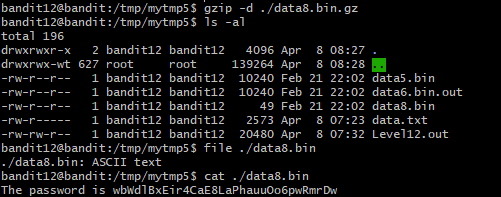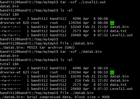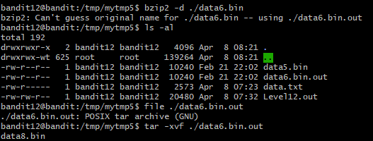 다음 레벨 패스워드는 data.txt 파일에 저장되어 있다. 이것은 반복적으로 압축된 16진수 덤프 파일이다. /tmp 디렉터리 아래에 mkdir 을 이용하여 작업을 하는 것이 도움이 될 수 있다. 예를 들어, 디렉터리 생성(mkdir /tmp/myname123)후 cp 로 데이터 파일을 복사하고 mv 로 이름을 바꿀 수 있다.
