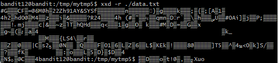 The password for the next level is stored in the file data.txt, which is a hexdump of a file that has been repeatedly compressed. For this level it may be useful to create a directory under /tmp in which you can work using mkdir. For example: mkdir /tmp/myname123. Then copy the datafile using cp, and rename it using mv (read the manpages!)
