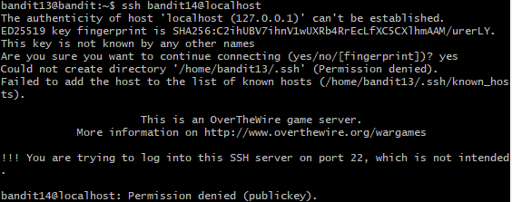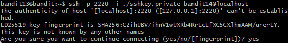 The password for the next level is stored in /etc/bandit_pass/bandit14 and can only be read by user bandit14. For this level, you don’t get the next password, but you get a private SSH key that can be used to log into the next level. Note: localhost is a hostname that refers to the machine you are working on