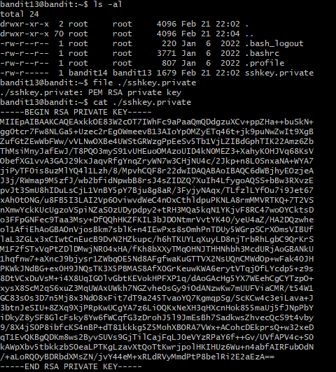현재 레벨에서는 다음 레벨의 패스워드를 얻지 못하지만, private SSH 키를 이용하면 다음 레벨에 로그인 할 수 있다.